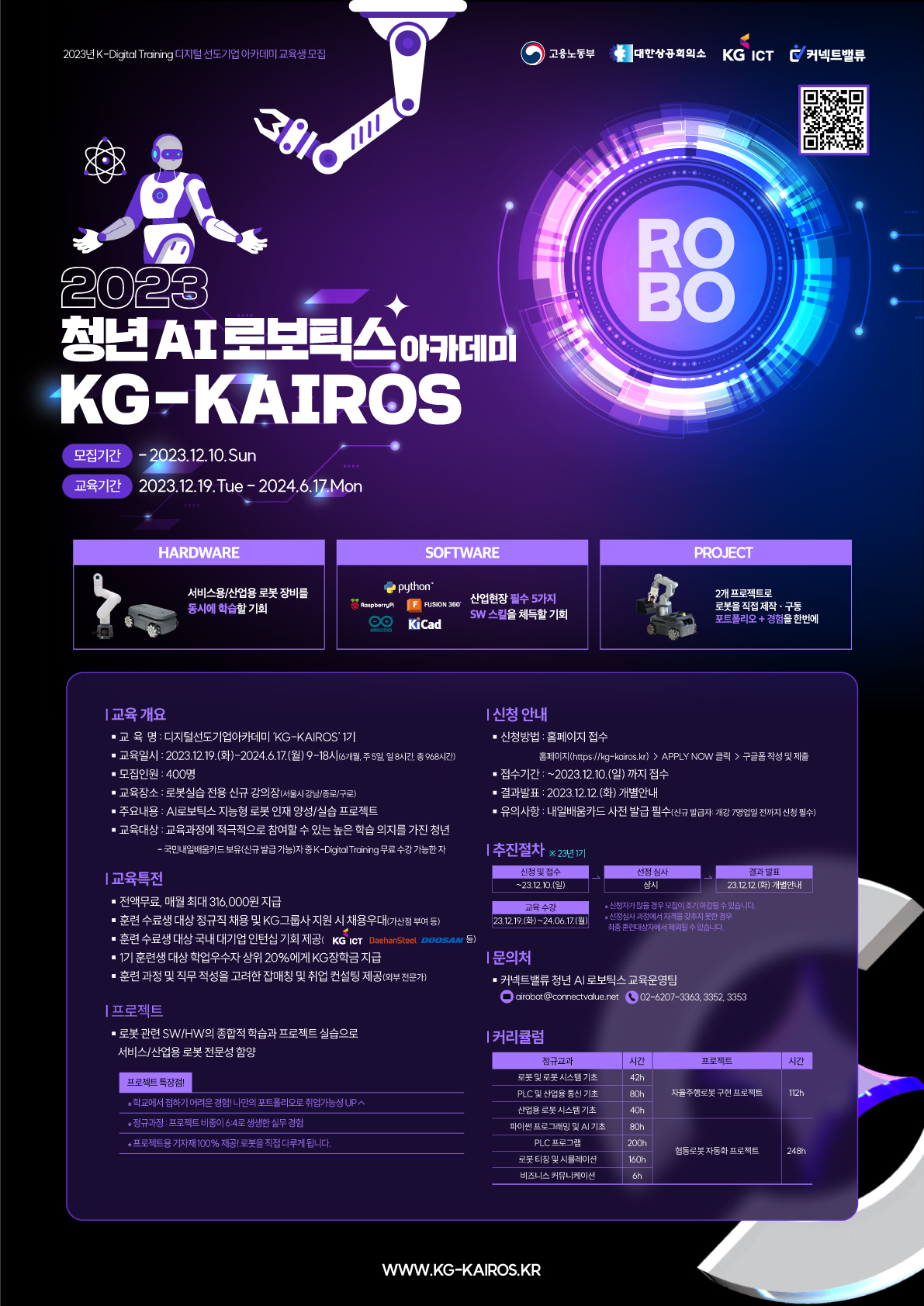 ����고용노동부 X 대한상공회의소 X KG ICT X 커넥트밸류���� 6개월간의 장기 프로젝트 실습 교육으로  기초부터 차근차근!  전공자 & 비전공자 모두 로봇산업의 전문가로 나아가자!  ����과정 신청 바로가기 :  https://forms.gle/rB3mLpxig5BYEsA5A ���� 차세대 로봇 산업의 전문 인재로 성장할 기회 ���� 서비스용/산업용 로봇 장비를 동시에 학습할 기회 ���� 이론과 장기 프로젝트형 실습(2~3개월)으로 실무형 인재로 거듭날 기회 ���� 산업현장 실무 필수 SW 스킬역량을 체득할 기회 체계적인 실무형 인재 양성 커리큘럼을 통해  단 6개월만에 취업을 위해 달려가게 됩니다.  ✅ 교육 개요 - 교육일시 : 2023. 12. 19.(화) ~ 2024. 6. 17(월) 9:00시 ~ 18:00시 (6개월/ 주 5일, 일 8시간/  총 968시간) - 모집인원 : 400명 - 교육장소 : 로봇실습 전용 신규 강의장(서울시 강남/종로/구로) - 교육대상 : 교육과정에 적극적으로 참여할 수 있는 높은 학습 의지를 가진 청년    *국민내일배움카드 보유(신규 발급 가능)자 중 K-Digital Training 무료 수강 가능한 자 ✅ 교육 내용 [정규 교과] - 로봇 및 로봇 시스템 기초 (42H) - PLC 및 산업용 통신 기초 (80H) - 산업용 로봇 시스템 기초 (40H) - 파이썬 프로그래밍 및 AI 기초 (80H) - PLC 프로그램 (200H) - 로봇 티칭 및 시뮬레이션 (160H) - 비즈니스 커뮤니케이션 (6H) [프로젝트] - 자율주행로봇 구현 프로젝트 (112H) - 협동로봇 자동화 프로젝트 (248H) ✅교육생 혜택 - 학업우수자 상위 20% KG장학금 지급(1기 훈련생 대상) - 훈련 수료생 KG그룹사 채용 연계   (KG그룹 계열사 직접 채용 / 서류전형 면제 / 실무파악의 기회 제공) - 훈련 수료생 대상 대기업 인턴십 연계 제공(두산로보틱스, KG) - 개별 맞춤형 취업 지원 서비스   (현직자 특강 / 1:1 커리어 상담 / 이력서 컨설팅 / 모의면접) - 학습매니저 1:1 밀착케어로 중도포기 ZERO - 테마별 스터디 운영으로 노베이스 비전공자도 걱정 NO ✅ 지원 안내 - 지원 방법 : KG KAIROS 홈페이지( https://kg-kairos.kr/ - 접수 기간 : ~2023. 12. 10.(일) 까지 접수 - 결과 발표 : 2023. 12. 12.(화) 개별 안내 - 유의사항 :  내일배움카드 사전 발급 필수(신규 발급: 개강 7영업일 전까지 신청 필수) ✅ 문의처 (커넥트밸류) 청년 AI로보틱스 교육운영팀  ���� airobot@connectvalue.net ☎️ 02-6207-3363/3352/3353 ���� https://kg-kairos.kr/ ����KG-KAIROS 란? - AI 지능형 로봇 분야 청년 인재 양성 교육 - 고용노동부 국비지원/전액 무료 교육 - KG 모빌리티 등 KG 그룹 채용 우대 - 로봇 실습 장비(Robot Arm, TutleBot 등), 노트북 지원, 매월 훈련장려금 최대 316,000원 및 KG그룹 장학금 지원 - 전문 취업지원 서비스, 인턴십 연계 제공 ✨ 전공자는 로봇 프로젝트를 통해 포트폴리오를 만들 수 있는 "특별한" 기회를! ✨ 비전공자는 무료로 로봇 전문가가 될 수 있는 "유일한" 기회를! ✨ 취업 또는 이직 준비생은 유망 로봇산업으로의 "입문" 기회를! KG-KAIROS에 참여할 미래 AI로보틱스 인재를 기다립니다����